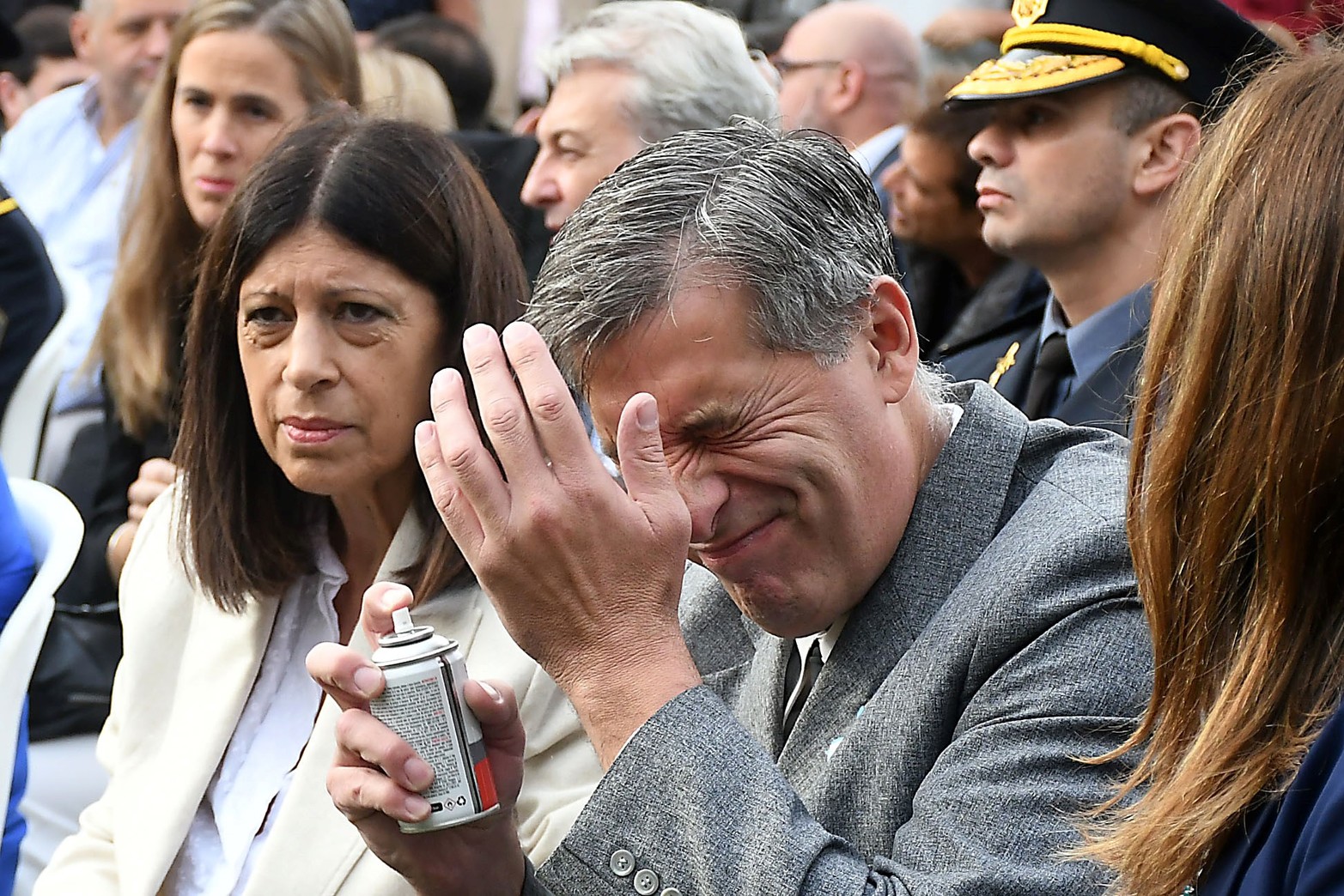 1 / 10 El ministro de Economía de la provincia Pablo Olivares se coloca repelente en el acto por el día del Veterano y de los Caídos en la guerra de Malvinas. Foto: Flavio Raina