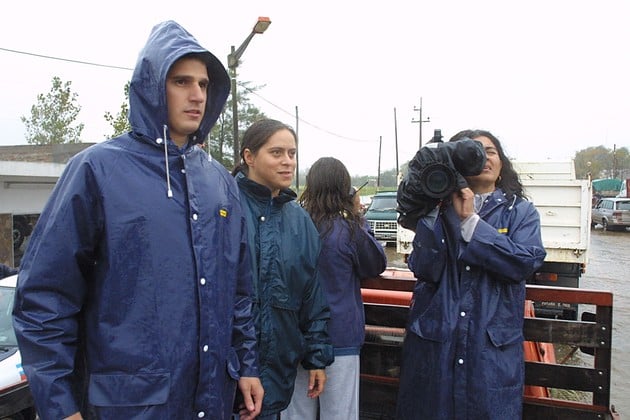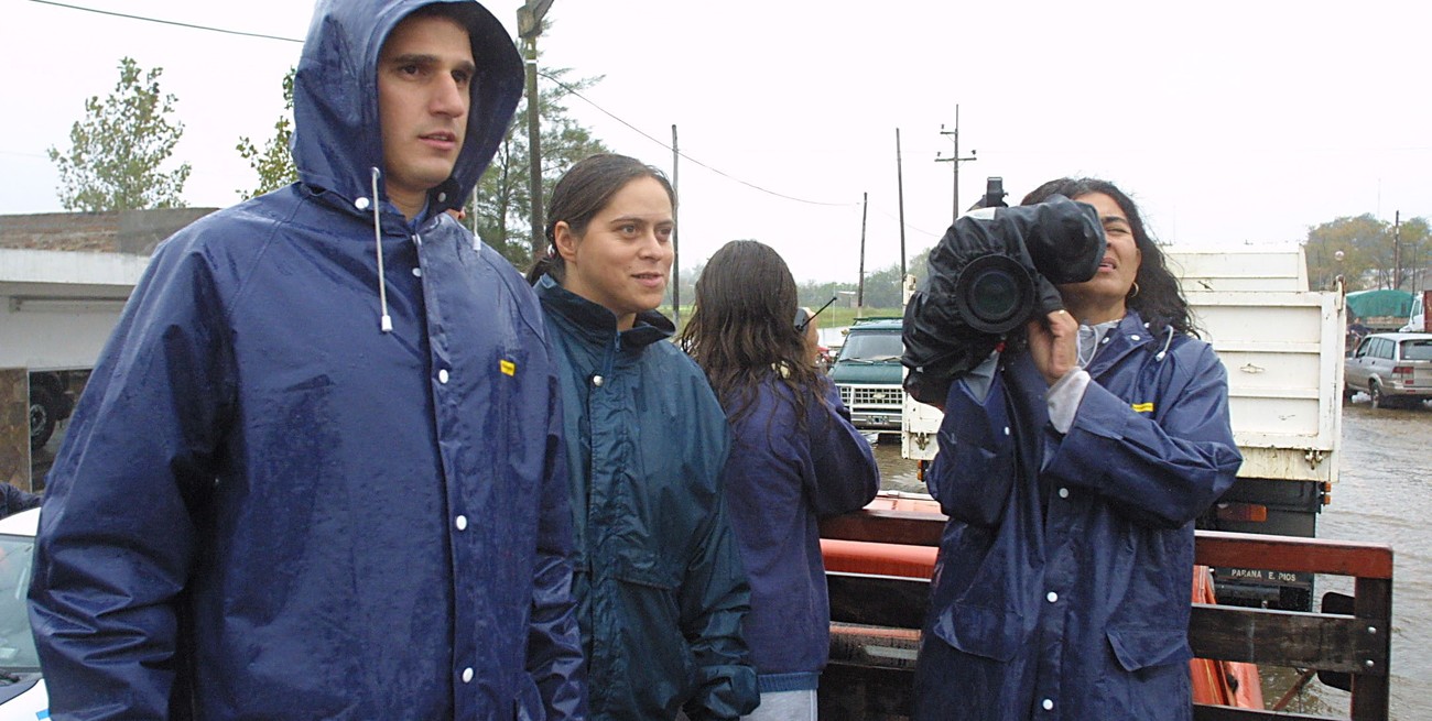 Reporteros. Los periodistas Araceli Retamoso y Nicolás Loyarte, junto a la camarógrafa Maricel Massat, subidos a un camión, durante las tareas de relevamiento de la situación ante el avance del agua. Crédito: Amancio Alem.