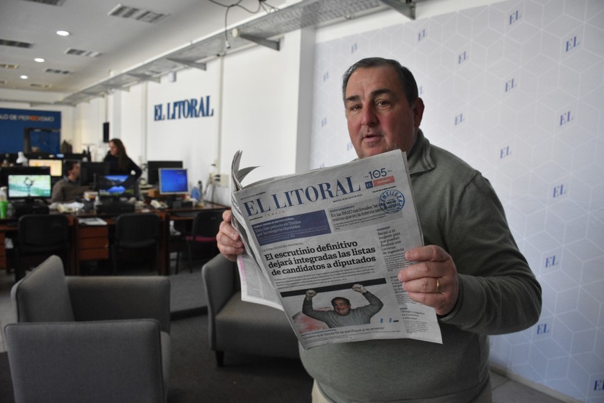 “Soy noticia”. El candidato visitó la redacción de El Litoral y se llevó el diario en el que fue tapa. Crédito: Mauricio Garín