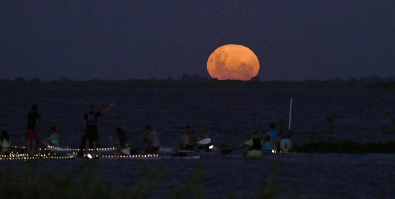 Remeros, kayakistas y practicantes de SUP recibieron al astro que gira alrededor del planeta y brilla iluminado por la luz del sol reflejada sobre su superficie.