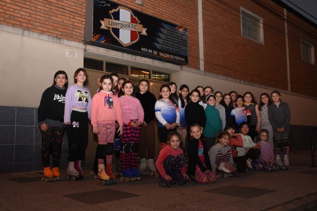 Las niñas de la clase de patín posan para la cámara de El Litoral; arriba, el logo de la institución. Crédito: Manuel Fabatía