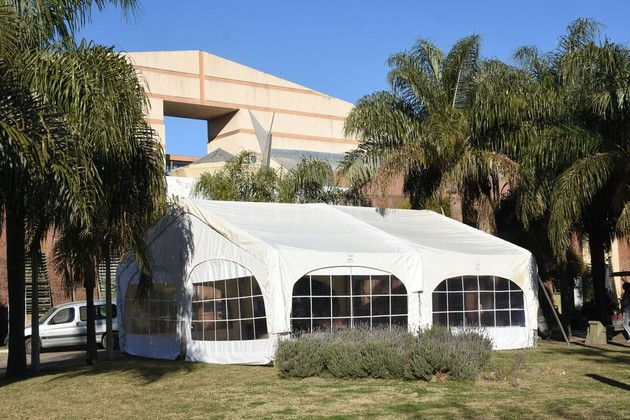 Flavio Raina En esta carpa, ubicada frente a la puerta principal del hospital Alassia, se registrarán los pacientes menores que recibirán su primera dosis en los 12 consultorios que preparó el nosocomio.Flavio Raina En esta carpa, ubicada frente a la puerta principal del hospital Alassia, se registrarán los pacientes menores que recibirán su primera dosis en los 12 consultorios que preparó el nosocomio.
