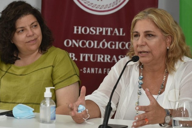 El tercer punto del itinerario fue el hospital Oncológico Iturraspe, donde ambas ministras dialogaron con los medios, en particular sobre el aporte de Nación de aparatos de lectura de VPH, virus de papiloma humano que es posible de detectar de manera precoz para evitar el desarrollo del cáncer de cuello de útero.