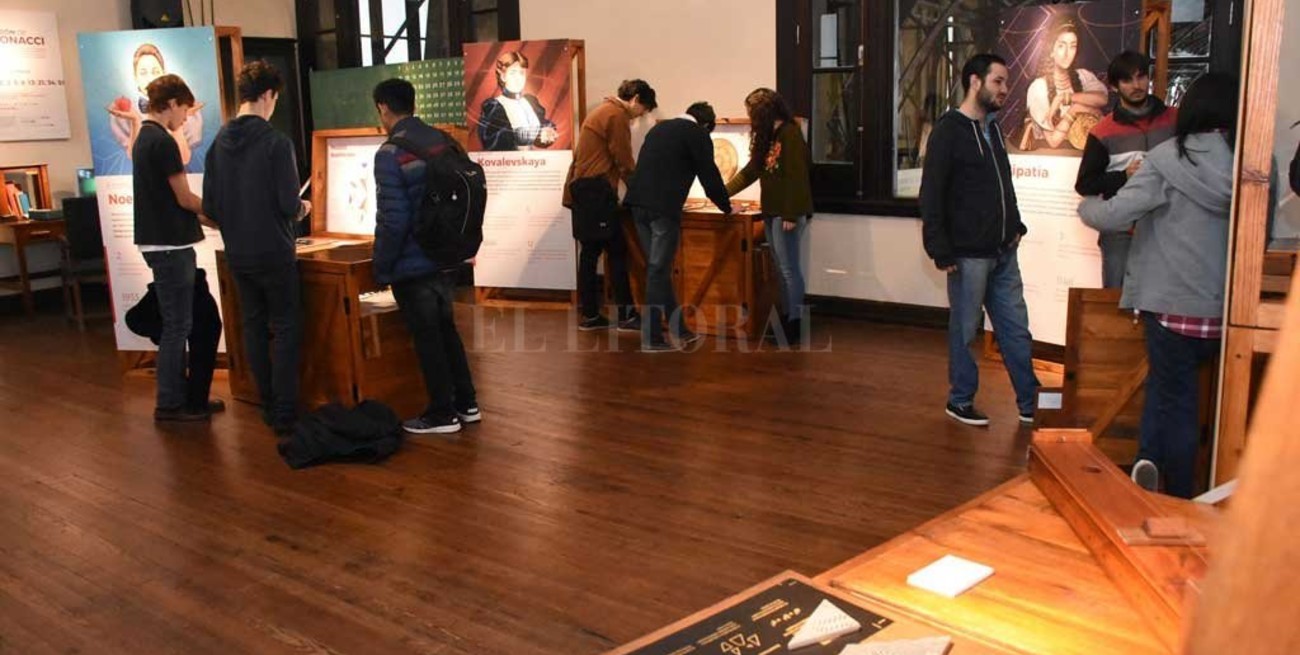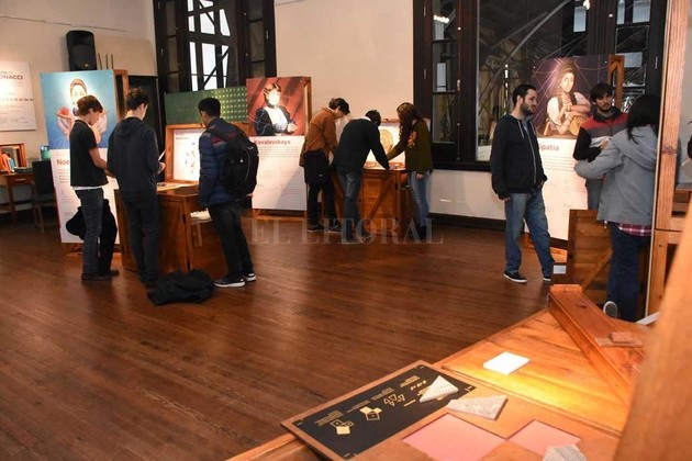 En otro de los armarios hay un juego de simetrías. Muchas piezas de colores deben ser colocadas siguiendo dos líneas. “No pará, vamos a acomodar las partes así”, están de acuerdo Nico y Pablo. Una vez lograda la figura, debe reflejarse sobre un espejo. Y se muestra un número. Pista resuelta. Otro de los participantes, siguiendo una consigna, logra dar con el libro favorito de Sofia Kovalevskaya, otra de las grandes matemáticas universales. Pero hay un engaño: la clave es un número de una página de otro libro que hay que buscar en otra vitrina, y que tiene un mensaje escrito con tinta invisible.