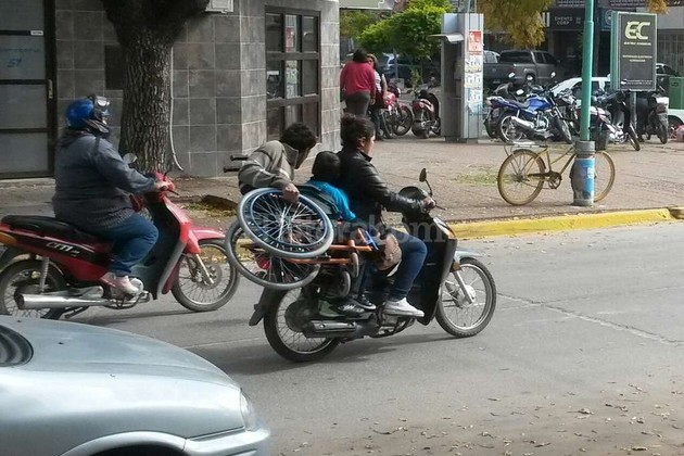 A primera vista se observa en la imagen a una mujer que circula a bordo de una moto sin usar casco, hasta aquí una infracción de tantas que a diario se observan en las calles de cualquier ciudad del país. Este caso suma un detalle no menor, como acompañante a bordo del birrodado va un chico (también sin protección) y completa el cuadro como tercer pasajero un hombre que lleva colgada de un brazo una silla de ruedas. Un dato final, la moto no tiene patente.