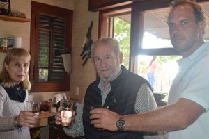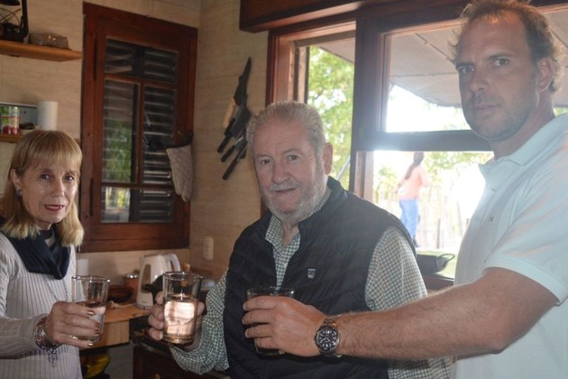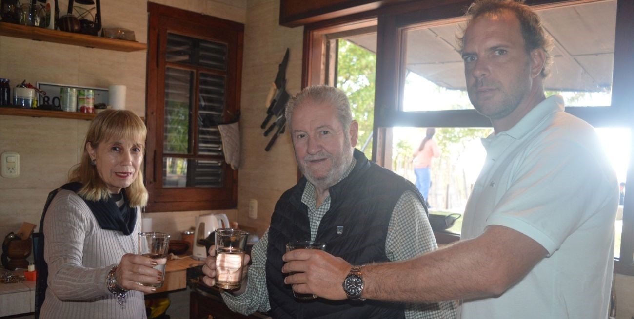 El jefe de Gobierno, Beto Pallero; la secretaria de Desarrollo Social, Marta Fantón, brindando con agua junto al vecino del Paraje Costa El Chaquito, Federico Viudez, tras la inauguración de la obra.