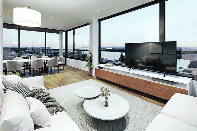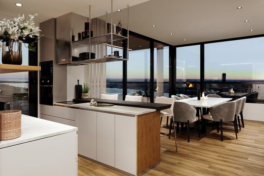 “El atributo principal del proyecto es la ubicación. Una de las premisas de los proyectistas fue que todos los ambientes tengan expansión al exterior y que el paisaje que lo rodea forme parte del departamento, por eso trabajamos con todas las superficies vidriadas, con mucha iluminación y las visuales que son geniales”, comentó Martínez respecto a la imponente vista del Puente Colgante, de la laguna y la vegetación ribereña que podrán contemplar quienes habiten en Visum.