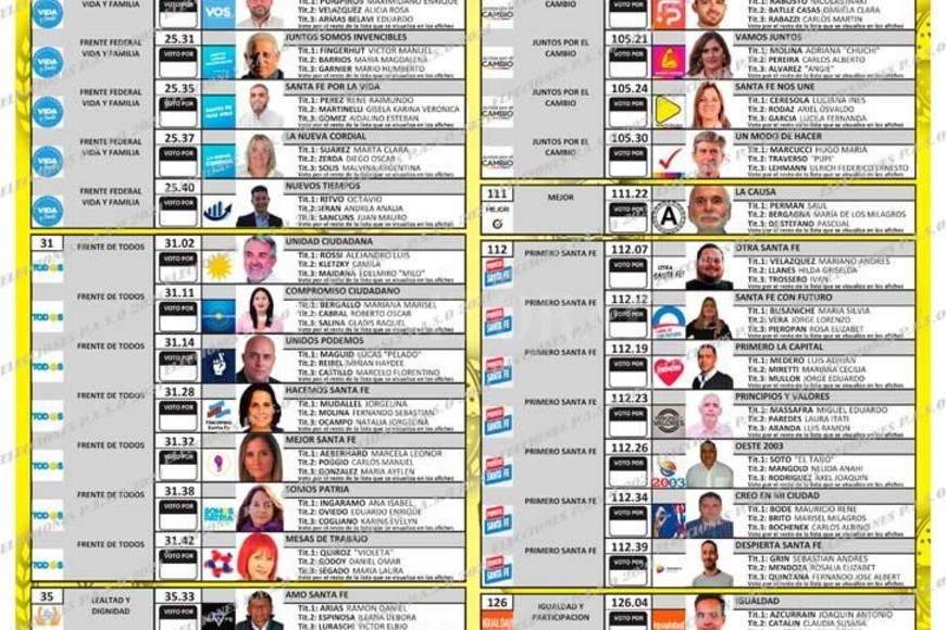 Por sorteo, realizado en Lotería de Santa Fe, el Frente de Izquierda es quien aparece en el primer lugar de la boleta (arriba a la izquierda), luego aparece el Frente Progresista y más abajo Vida y Familia. Luego siguen: Alejandro Rossi como el primero del Frente de Todos, por debajo aparecen: Mariana Bergallo (Compromiso Ciudadano); Lucas Maguid (Unidos Podemos), Jorgelina Mudallel (Hacemos Santa Fe); Marcela Aeberhard (Mejor Santa Fe); Ana Ingaramo (Somos Patria) y Violeta Quirós (Mesas de Trabajo). A continuación, Lealtad y Dignidad, Unite por la Libertad y la Dignidad (cuatro nóminas), Soberanía Popular y Unión Federal, ambas con listas únicas.