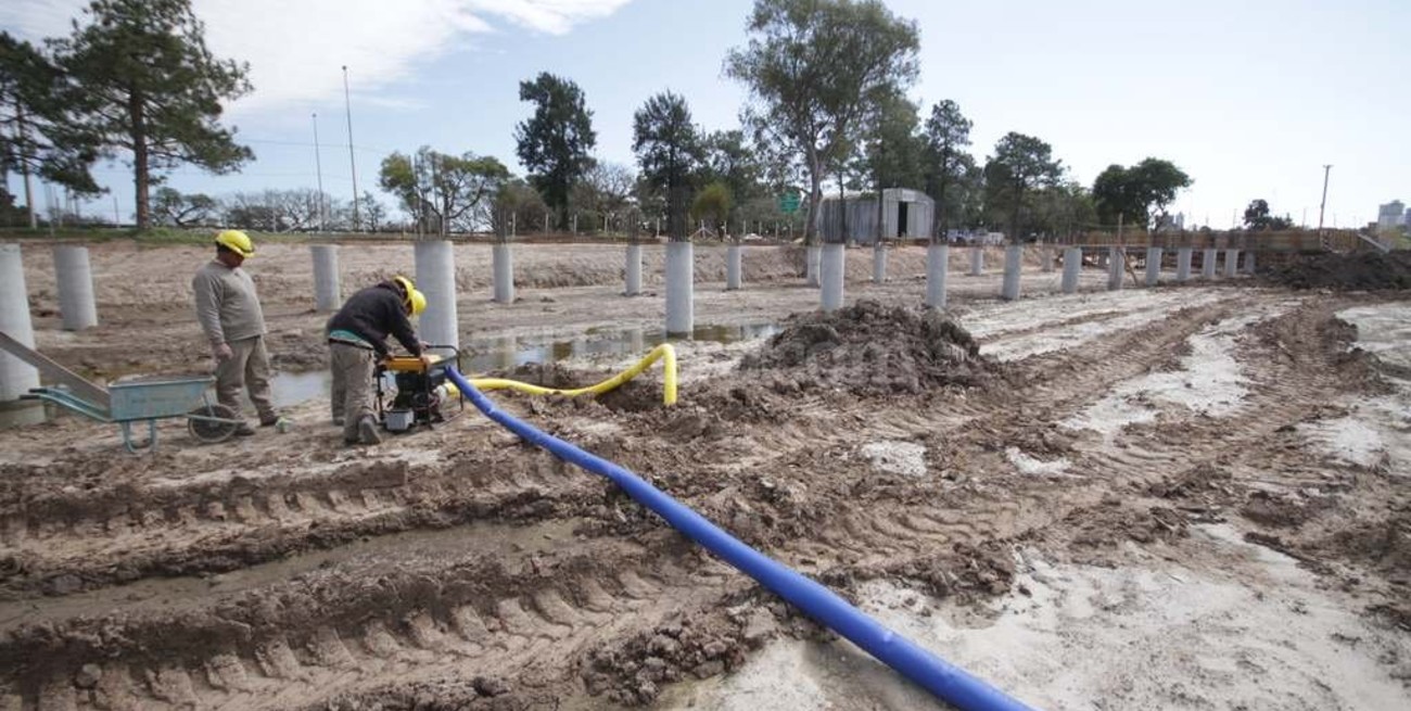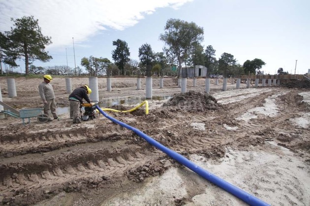 Es por ello que los operarios de Mundo Construcciones —empresa adjudicataria que lleva adelante las obras— deben bombear el agua que emana sobre la superficie por la napa e inunda la zona donde se ubican los 53 pilotes construidos a 11 metros de profundidad, desde los cuales se levantan las columnas de 70 centímetros de diámetro que sostienen el piso del edificio, que es lacustre, es decir que una vez terminada la obra no será afectado por futuras crecidas.