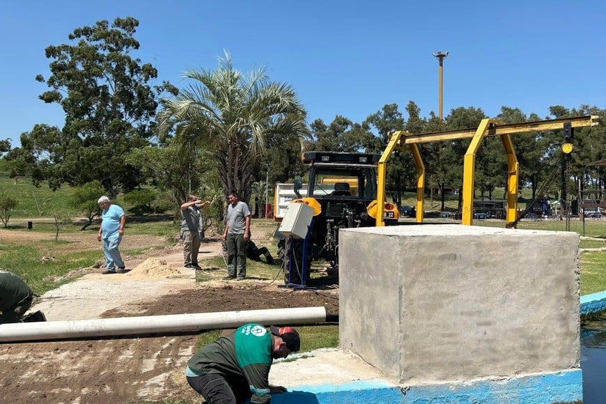 Cuadrillas municipales trabajan en el reacondicionamiento de los piletones del Parque del Sur de la ciudad de Santa Fe, que fueron vaciados en los últimos días para ese propósito y se está instalando una bomba centrífuga para la remoción y recirculación del agua en el piletón central.