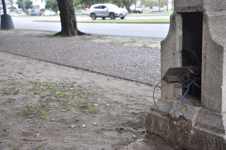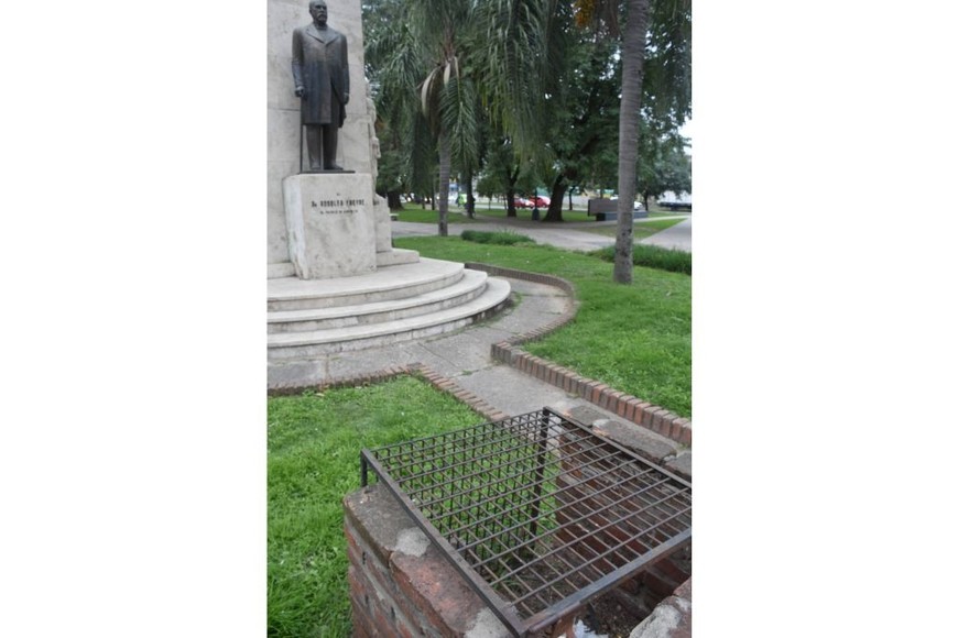 Uno de los reflectores que iluminaba la estatua del Dr. Rodolfo Freyre -político, abogado y periodista, gobernador de Santa Fe entre 1902 y 1906- ya no está. Crédito: Luis Cetraro