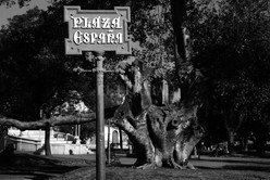 Postal de la Plaza España. En foco, la fuente con la estatua de la mujer, fuera de uso; detrás, un árbol talado y el pequeño escenario (retreta). Crédito: Pablo Aguirre