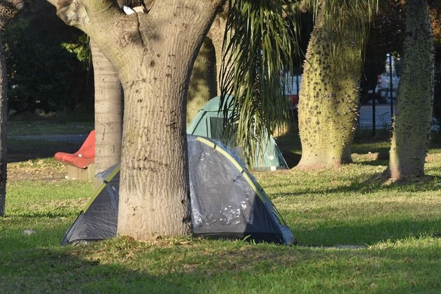 En el “corazón” del Predio Ferial Municipal, frente al Centro Territorial de Denuncias, se instalan por las noches dos carpas dentro de las cuales duermen indigentes. Curiosamente, a la mañana levantan “campamento” y se van, y vuelven a la noche siguiente. Así, sucesivamente.