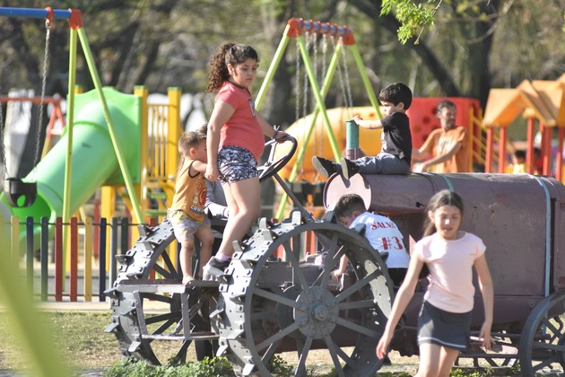 En la Plaza Domingo F. Sarmiento, donde se emplaza el Parque de la Locomotora, una pareja mateaba bajo la sombra de un árbol. El sol "picaba" un poco, es cierto: "Con estos calores, la verdad que ahora está mejor para una cervecita", dice con una risotada Noelia, bajo la mirada cómplice de su pareja, Emilio. La pequeña princesa, la hija, es Catalina, y llega en ese momento agitada por haber estado en la hamaca.