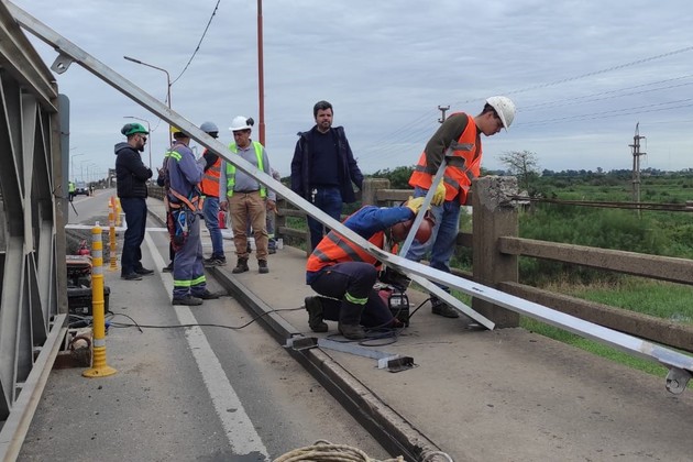 Operarios de Vialidad Nacional instalaron estructuras metálicas en el viaducto para iniciar los arreglos. La movilización de equipos y el armado se ejecutó de manera paralela al puente de emergencia, sobre la mano a Santo Tomé, sin afectaciones en el paso alternado por el Bailey.