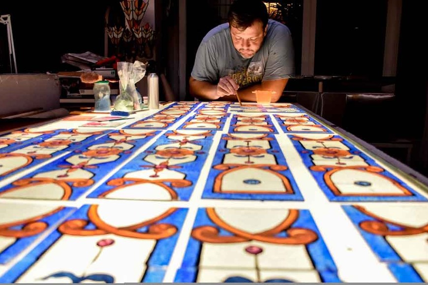 Fabio Huser fue el encargado de dirigir el equipo de ocho especialistas dedicados a restaurar los vitrales y las rejas. En la Casa de la Cultura hay 12 aberturas con vitrales que tienen más de 40 paneles cada una. “El estado original era muy precario, algunas por falta de cuidado otras por fallas técnicas. Casi en su totalidad, los vitrales habían desaparecido, quedaban solo vestigios pero que para nosotros fueron muy importantes para reconstruir todo el proyecto, a tal punto que encontré en el patio partes de plomo que habían quedado bajo el pasto”, precisó Huser.