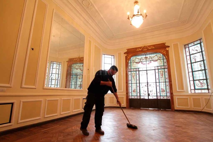 En febrero de este año la tarea comenzó en los pisos de la planta baja. “El centro del dibujo del hall principal no tenía piso, estaba todo podrido y roto”, resaltó. Para reconstruir este sector, el roble eslavonia que utilizaron fue traído de Mendoza. Una vez en el taller, se machimbró y acondicionó para colocarlo en la superficie con cortes especiales, con la mente puesta en el dibujo del piso original. “El trabajo en el hall central nos llena de gratificación porque logramos recomponer el dibujo con madera nueva”, valoró.