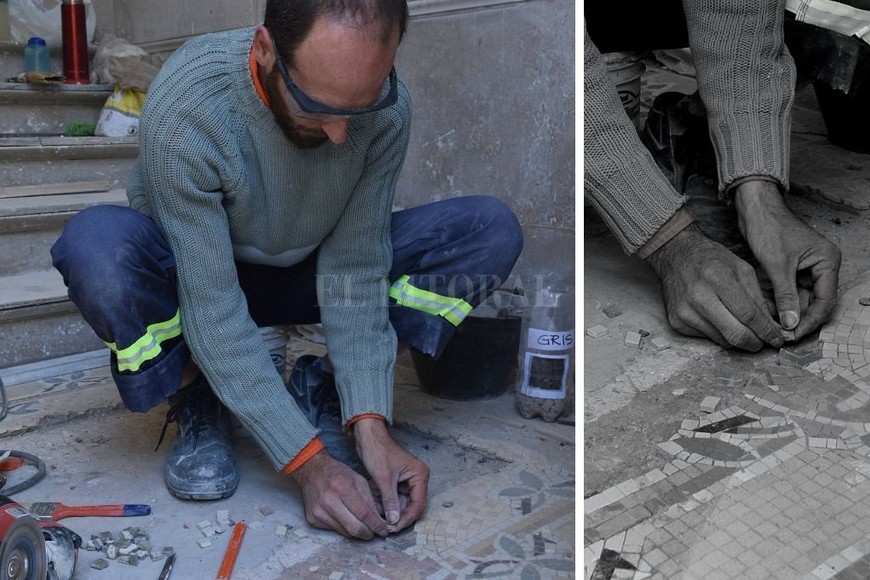 Rompecabezas. La milimétrica tarea de reconstruir los pisos de tesela la llevaron adelante los bonaerenses Carlos Freico y Hernán Arduca. Foto: Luis Cetraro
