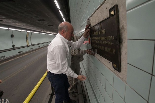Mauricio Garín Remoción. La placa se encontraba en el interior del túnel a unos 200 metros del ingreso del lado paranaense, colocada en la pared de la mano que va a Santa Fe.