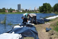 Defensas con bolsas de arena durante una crecida del río en Santa Fe.