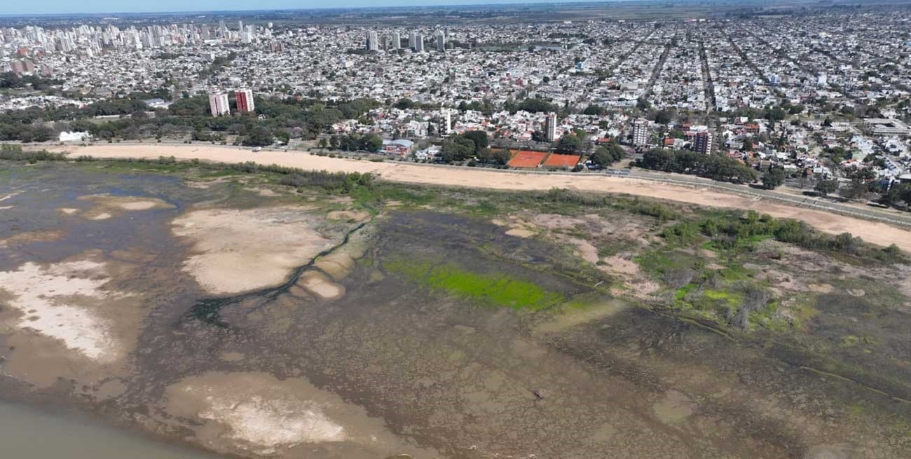 Las imágenes captadas por el drone de El Litoral muestran también cómo afloran los mal llamados bancos de arena, que no son otra cosa que suelo lagunar. Los espigones de las otroras playas de Guadalupe son testigos privilegiados de estos cambios de paisaje.