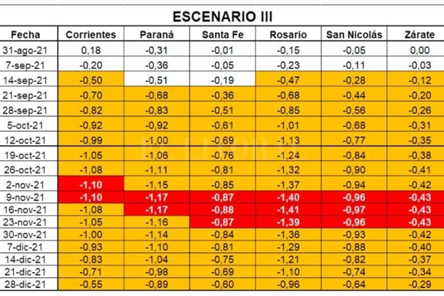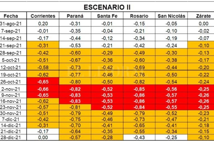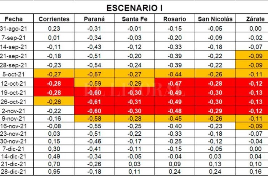 En tanto, en el tercer escenario, el más grave de los elaborados, se superarían los -0,20 mts también el 21 de septiembre pero con un nivel de - 0,36 mts.