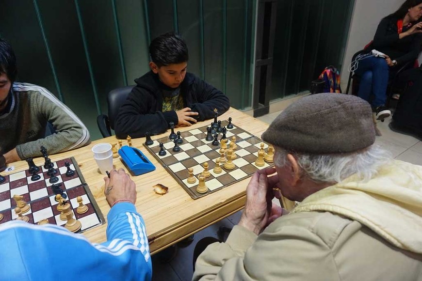Enroque. Un niño y un abuelo, cara a cara, con el tablero mediante.Foto: Gentileza