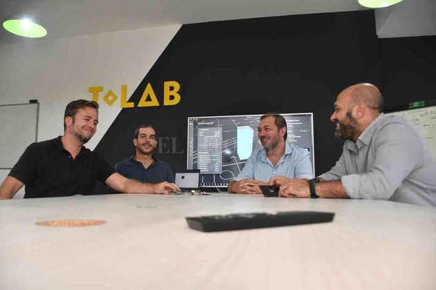 Manuel Fabatía Parte del equipo de T LAB. La empresa tecnológica local se apresta para una experiencia inédita en la ciudad y la región. De izquierda a derecha: Javier Nescier, Diego Favarolo, Fabián Molinengo y Ricardo González Maurer.