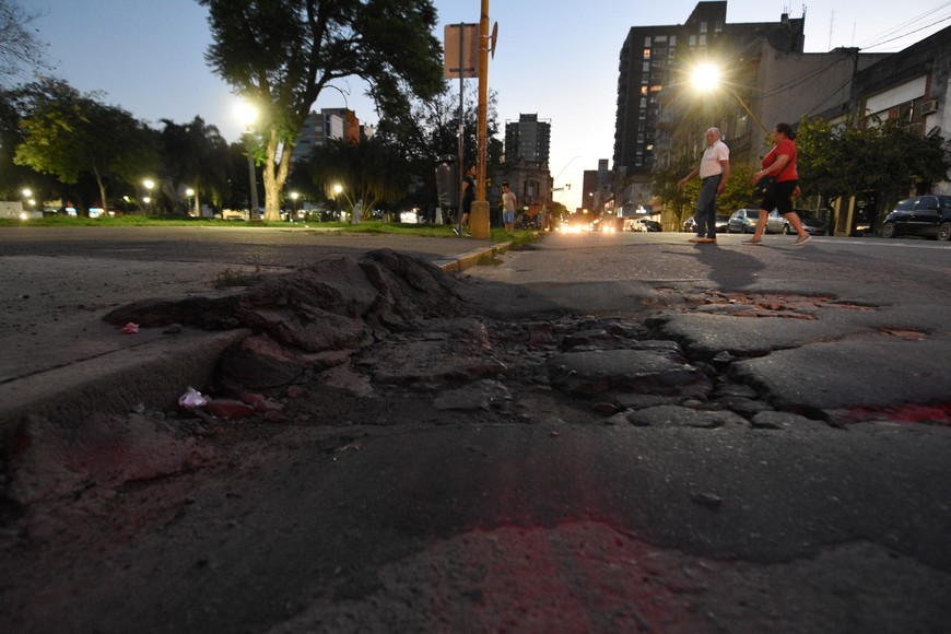 En San Jerónimo y Cándido Pujato, hay un tremendo bache. Por ahí pasa la línea 4. Crédito: Guillermo Di Salvatore