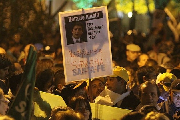 Miles de santafesinos participaron este miércoles por la tarde-noche de la marcha en repudio al fallo de la Corte Suprema que aplicó el cómputo del denominado 2x1 en favor de un condenado por delitos de lesa humanidad, y que motivó no solo actos similares en prácticamente todas las ciudades de importancias del país, sino también que el Congreso de la Nación aprobara una ley para aclarar y limitar el uso del 2x1. La convocatoria surgió del Foro Contra la Impunidad y por la Justicia de Santa Fe bajo la consigna “Señores jueces: Nunca Más. Ningún genocida suelto”. Esta fue una de las marchas más numerosas de los últimos tiempos en la capital provincial. La concentración fue en la Plaza del Soldado, en Mendoza y San Jerónimo. Desde allí iniciaron el recorrido pasando por el Tribunal Oral Federal, para llegar a la Plaza de Mayo, el epicentro de todas las manifestaciones.