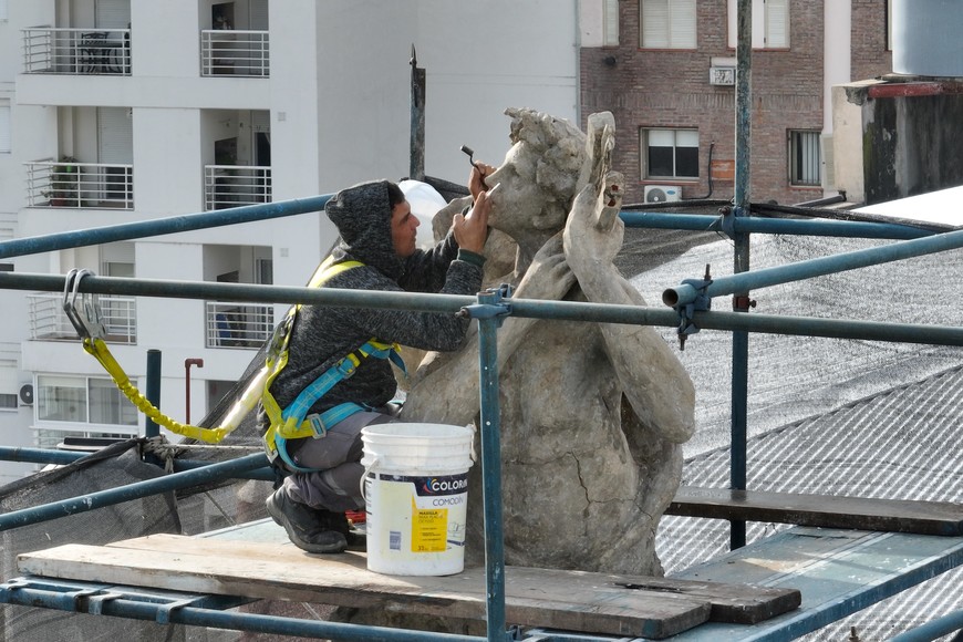 Bien alto. El restaurador está trabajando con el grupo escultórico que corona la parte superior del teatro, creación de Nicolás Gulli, con alegorías a la música y la danza. Crédito: Fernando Nicola