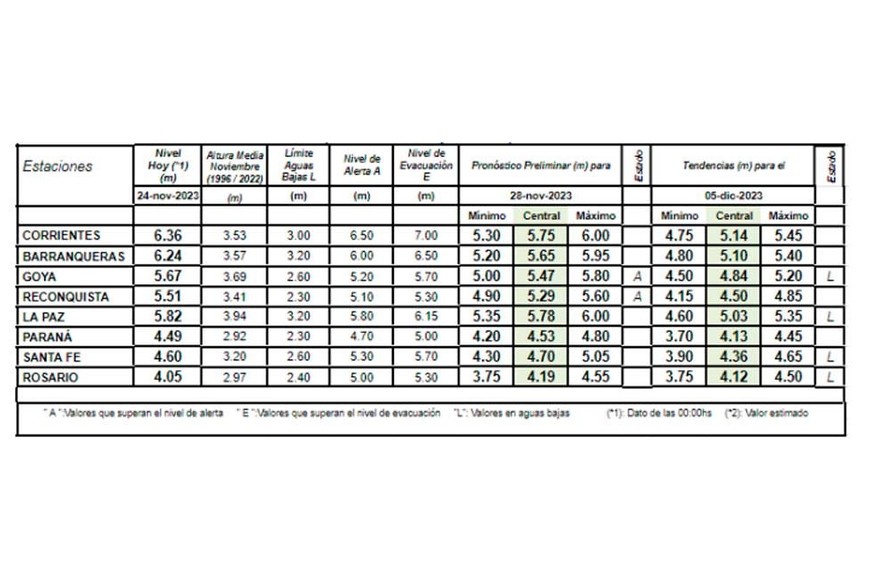 Para el 28 de noviembre, el organismo pronostica para Santa Fe 4,70 mts, para Rosario 4,19 mts y para Paraná 4,53 mts.