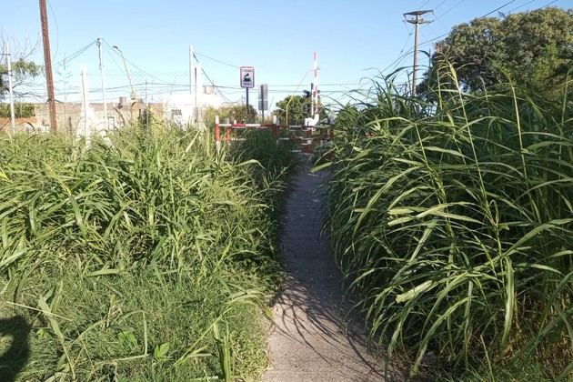 Es que la falta de mantenimiento y desmalezamiento del lugar hacen que la vegetación crezca tanto que ya superó el nivel de las barandas de la pasarela peatonal del cruce ferroviario. En consecuencia, quienes circulan por la zona deben tener precaución no sólo por el paso de la formación sino también por la posible presencia de alimañas y bichos en el suelo.