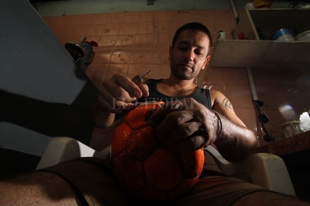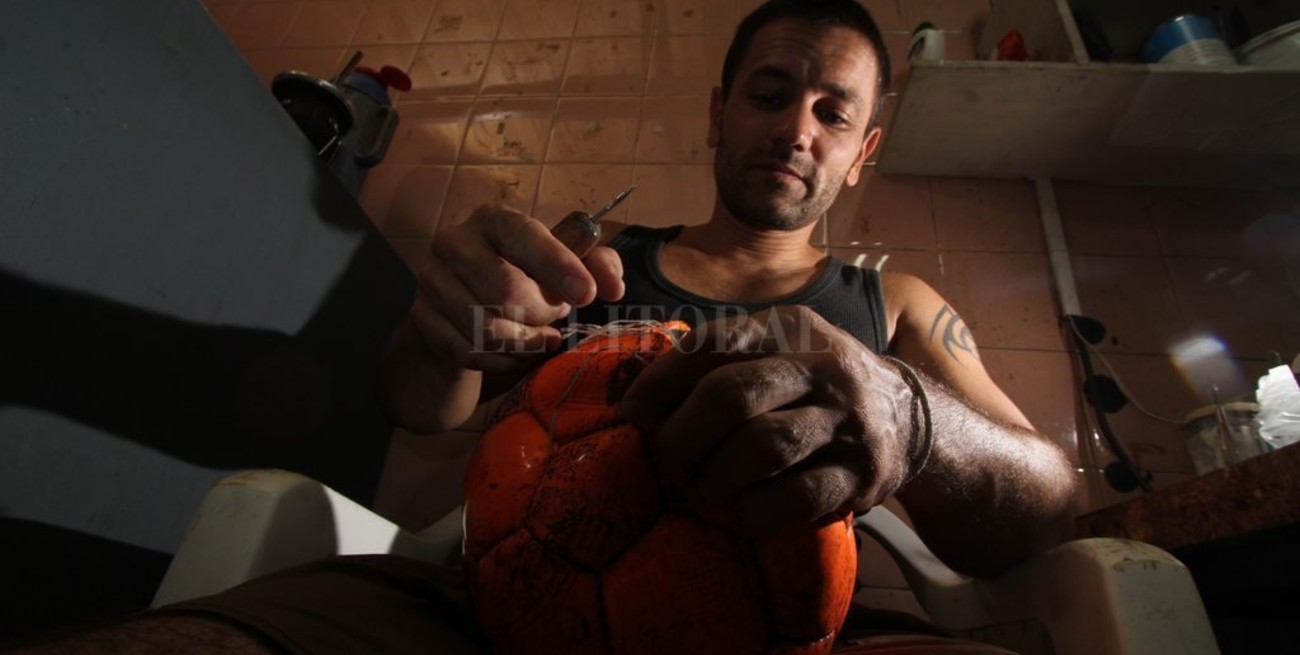 Jorge Varela afirma la pelota a reparar sobre su regazo, sus músculos se tensan y sus tatuajes se estiran. Tiene un taller de pelotas en barrio Candioti, adonde anexó la venta de todo tipo de productos deportivos. Lo llamativo es que recibe un promedio de 10 pelotas por día para reparar: de particulares, de escuelas —para las clases de educación física— y de clubes.
