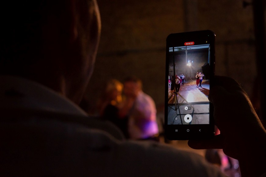Celular. Alguien registrando un momento de la milonga, que quizás lo esté llevando a sus años de mocedad. Crédito: Secretaría de Cultura y Educación municipal / Aimé Luna
