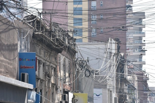 Un enjambre de cables aéreos en el microcentro. Crédito: Guillermo Di Salvatore