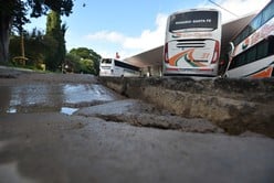 A diario, los choferes de colectivo que circulan por la calle interna de la terminal deben pasar por encima de pozos profundos. A veces los esquivan, pero otras les resulta imposible. Los días de lluvia es más complicado. Foto: Mauricio Garín.