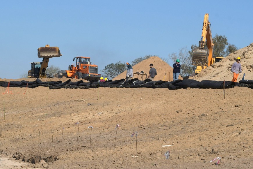 Una vez resuelto el punto crítico de la toma de agua, “falta colocar la protección (con la manta geotextil) sobre el refulado (de tierra), de unos 50 metros de largo. Y ya se está armando la cancha para hormigonar in situ los bloques que irán sobre la misma”, detalló la ingeniera.