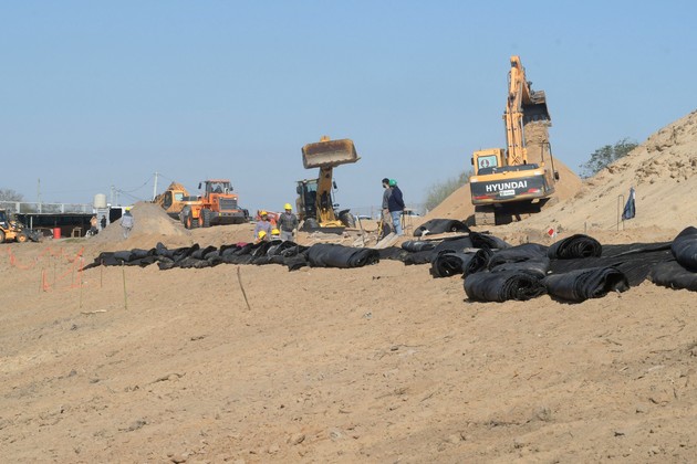 “Ya se refuló gran parte del terraplén. Queda pendiente la parte de la toma de agua y hacia aguas abajo”, indicó Reynares. Lo que se está ejecutando es la reconstitución del talud húmedo y protección del terraplén con bloques de hormigón adheridos a geotextil. Esta protección tendrá una longitud de 260 metros, paralelo al curso, y unos 50 metros hacia el centro del río, llegando hasta el talweg (línea que conecta los puntos más bajos de sucesivas secciones transversales de un cauce superficial) del mismo. Las mantas de bloques de hormigón sobre geotextil se colocarán en una superficie de 15.000 m².