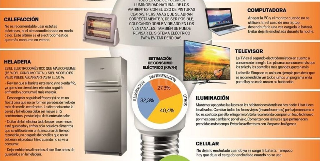 — Reducir consumos ociosos de electricidad (luces y electrodomésticos encendidos a solas, sin que algún miembro del hogar lo esté utilizando, vidrieras durante el día o fuera del horario comercial, burletes de heladeras defectuosos, etc.)