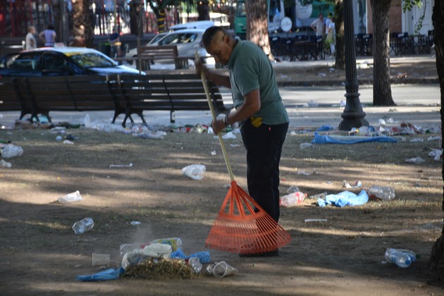 "Somos dos placeros para limpiar todo esto", dijo uno de ellos, con una escoba en la mano. Apenas podía acumular montañas de residuos en distintos sectores de la plaza. "Con estas bolsas no nos va a alcanzar para limpiar todo", dijo su compañera, desahuciada, al ver la plaza toda mugrienta. Sobre un banco del centro de la plaza había además una farola rota. Y sobre calle Sarmiento pasaba un camión recolector de residuos que frenó para llevarse sólo dos bolsas de consorcio. Nada. Y siguió rumbo al sur.