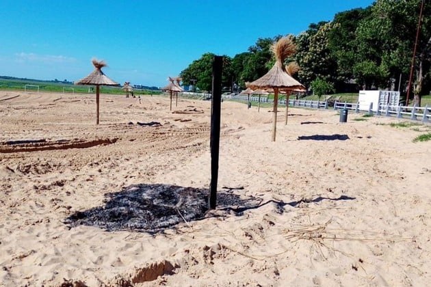 Personal de limpieza y mantenimiento de la playa municipal advirtió un incendio en una de las sombrillas instaladas para uso público.
