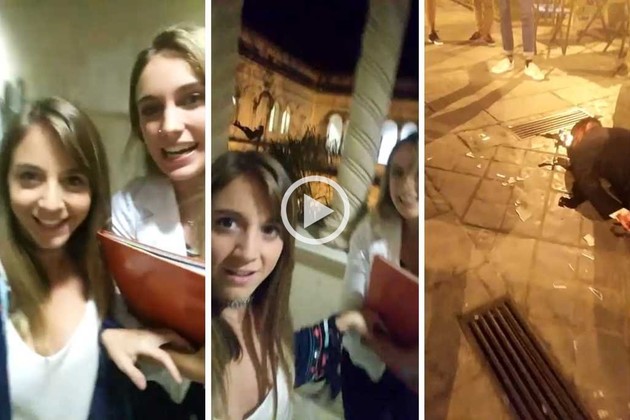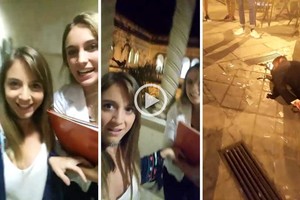 “Salimos de aprobar” festejan dos chicas mientras transitan en dirección a una de las escaleras. De repente, la cámara del teléfono celular gira y toma como un presunto hombre se arroja al vacío, cayendo al patio central del edificio.