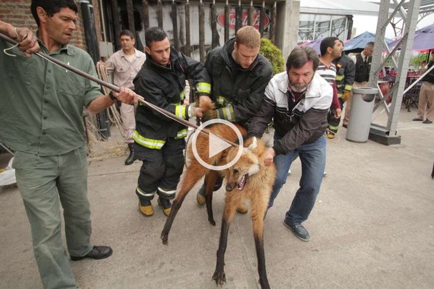 Al ver la presencia humana, el aguará se asustó e intentó escapar para la zona sureste. Encontró su ocasional "guarida" entre unas mesas y la estructura de madera que forma parte de la edificación del paseo de compras.