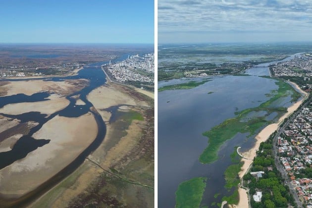 El drone de El Litoral captó imágenes de los fenómenos naturales. El estiaje de 2021 y la actual crecida del río Paraná.