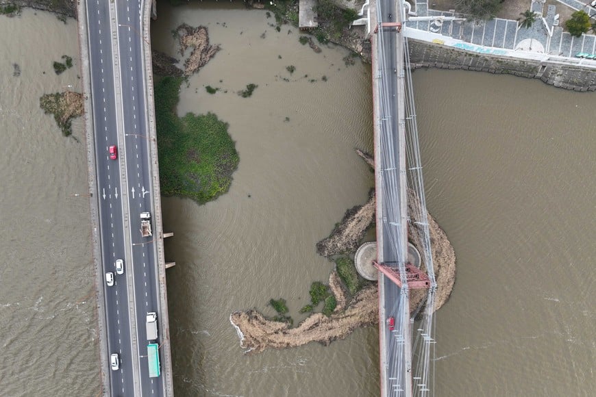Producto del viento, la flora acuática navegó río arriba y quedó posicionada no muy lejos de los pilares, despejando casi por completo el paso por donde alguna vez se sostuvo un puente. Sólo quedó “quieta” la porción de plantas desde la orilla oeste hasta el primer pilote.