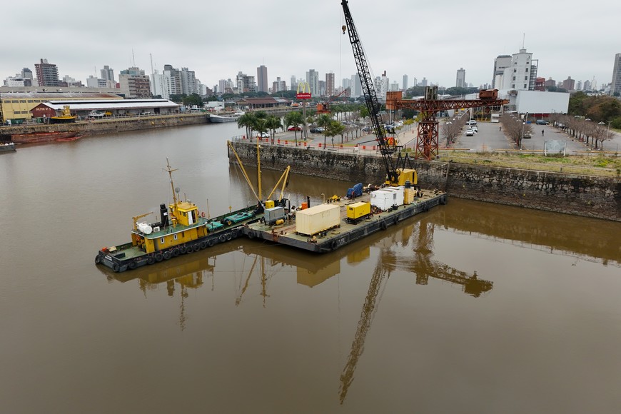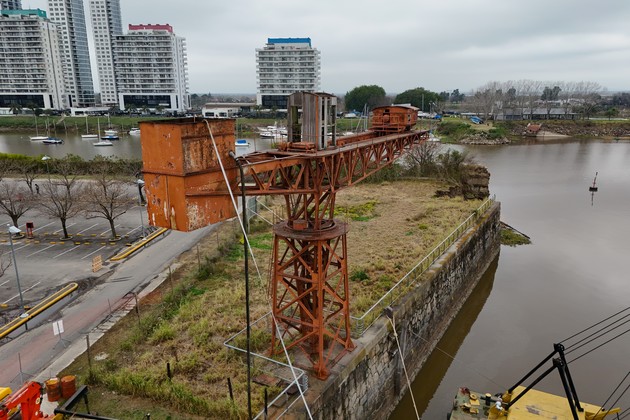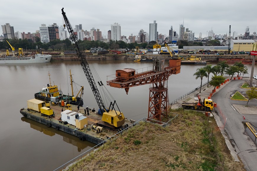 Para retirarla se utiliza una gran grúa emplazada sobre una balsa amarrada junto al muelle del Dique 1. Los operarios trabajan por estos días en las alturas. La idea es trasladar la gran grúa histórica a otro sector del puerto para garantizar la seguridad y estabilidad del suelo, ya que el sector a donde se ubica es la playa de estacionamiento del paseo de compras.