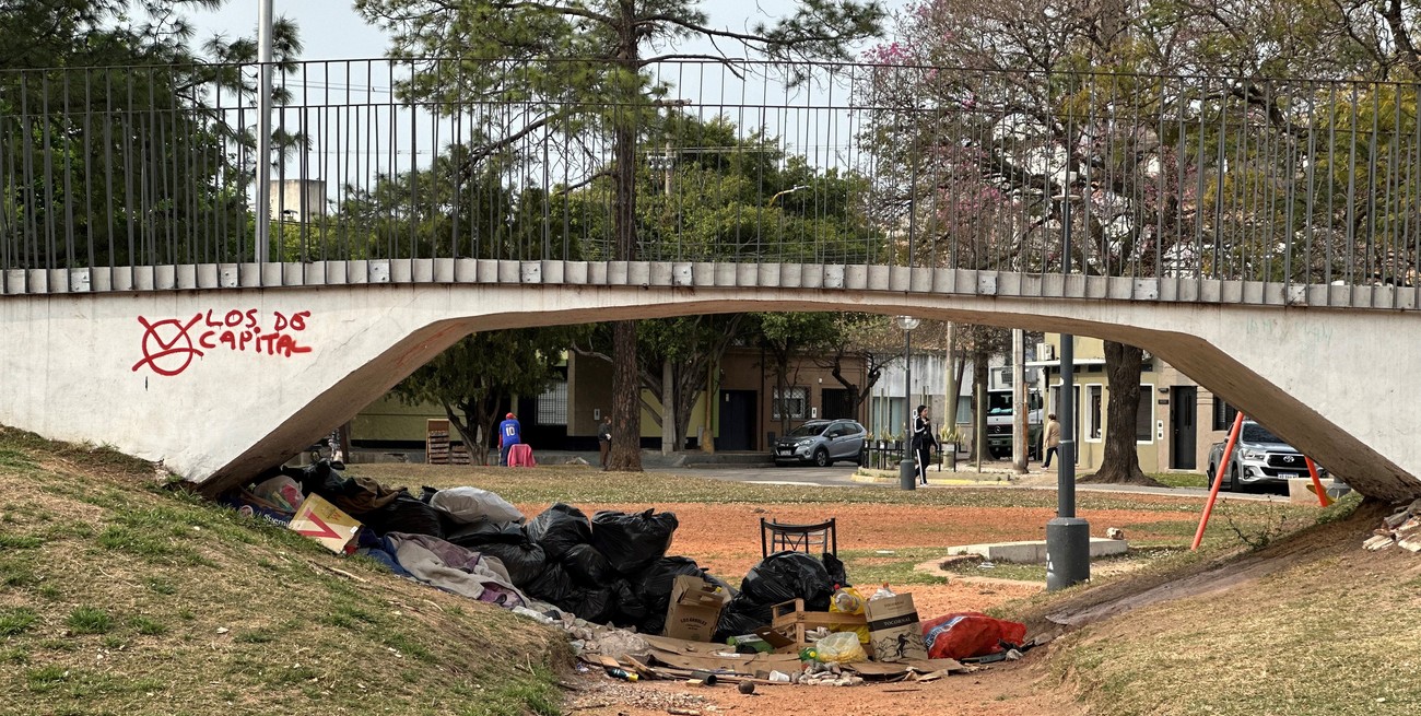 Bolsas, cartones y hasta una silla están desde hace varias semanas debajo del puente que surca el espacio público.