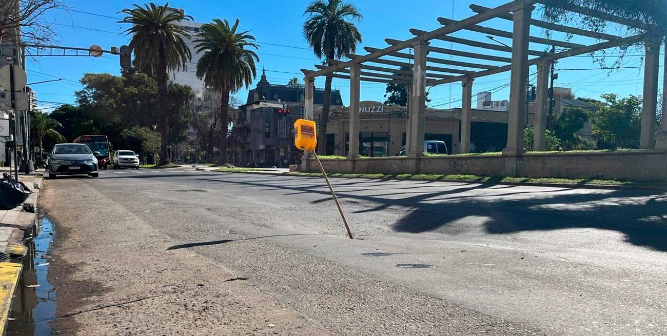 Como se aprecia en las imágenes, un vecino intervino en el lugar con un palo y un bidón, a modo de aviso para quienes transitan por bulevar.