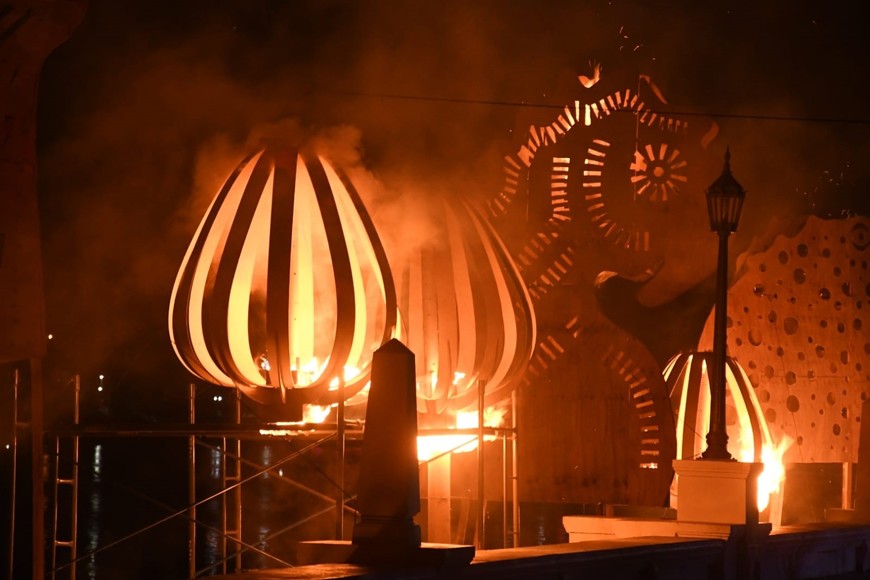A las 20.25, al ritmo del "Bombón asesino", los conductores reaparecieron para anunciar una "experiencia inmersiva": "Los constructores del fuego", una puesta performática que recreó el origen de la ciudad a través de construcciones móviles en madera, fuego, retroproyecciones acuosas, palabras y ambientación musical y sonora en vivo, de la mano de una formación con cuerdas, percusión y sintetizadores. Así se narró el encuentro de los conquistadores con la fauna local (serpientes, sapos, carpinchos). Finalmente, antorchas en mano, los artistas le dieron fuego a otras estructuras fijas, que ardieron como figuras de la noche de San Juan.